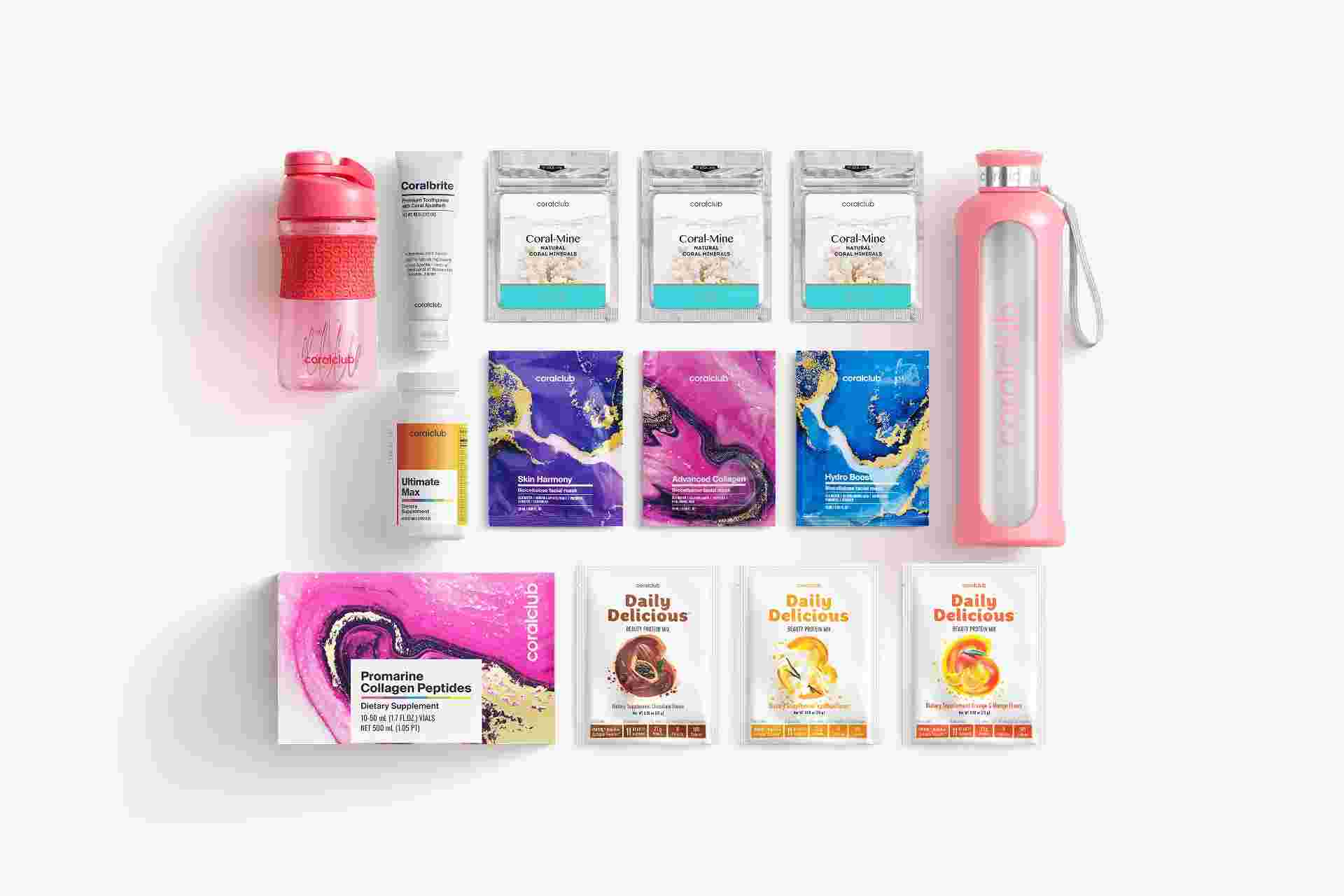 Coral-Mine (3 Pack), ClearWater glass bottle, 1000 ml, Hydroboost Facial Mask (1 single), Advanced Collagen Mask (1 single), Skin Harmony Mask (1 single), Daily Delicious (Chocolate) 25g, Daily Delicious (Vanilla) 25g, Daily Delicious (Orange-Mango) 25g, Coral Club Shaker, Cherry, 18.6 fl. oz Promarine Collagen Peptides, Coralbrite, Ultimate Max
